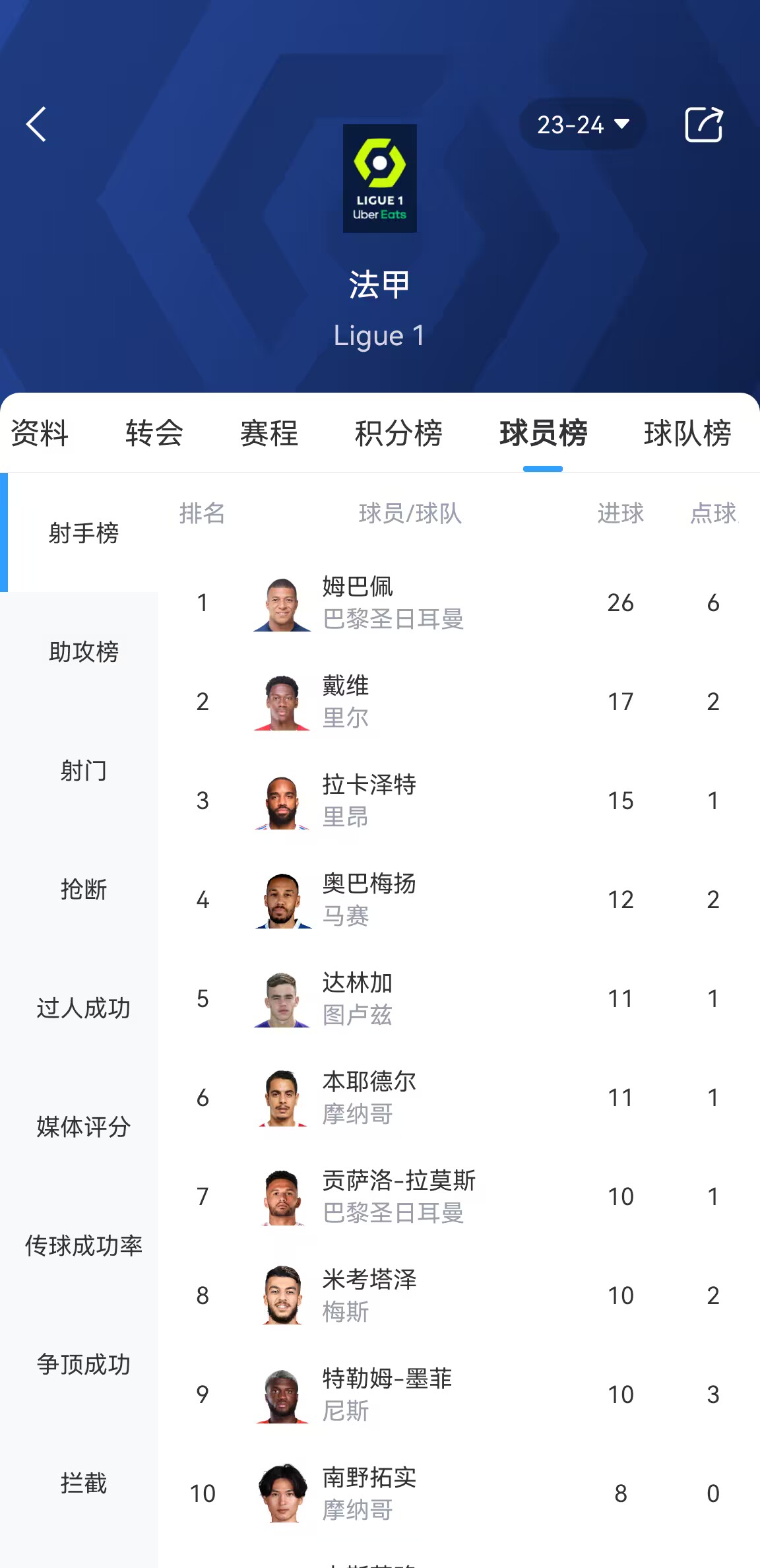 自2018-19賽季以來,姆巴佩已經(jīng)連續(xù)五個(gè)賽季贏得了法甲金靴獎(jiǎng),本賽季他有很大的機(jī)會(huì)連續(xù)六年贏得這一榮譽(yù)。姆巴佩本賽季進(jìn)了26個(gè)球,領(lǐng)先第二個(gè)9個(gè)球。