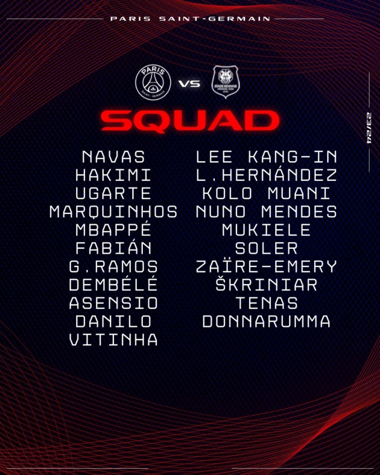 4月3日訊 北京時(shí)間明天凌晨,巴黎將在法國杯半決賽中對陣雷恩。巴黎宣布了這場比賽的球員名單,由姆巴佩和登貝萊領(lǐng)銜,馬爾基尼奧斯回歸。