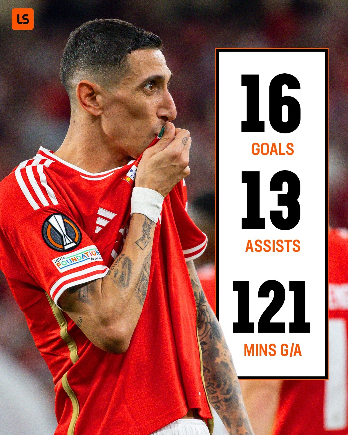36歲的迪馬利亞本賽季為本菲卡打了43場比賽,攻入16球,助攻13次,幫助本菲卡進(jìn)入歐羅巴聯(lián)賽8強(qiáng),葡萄牙超級聯(lián)賽排名第二,落后葡萄牙體育4分。